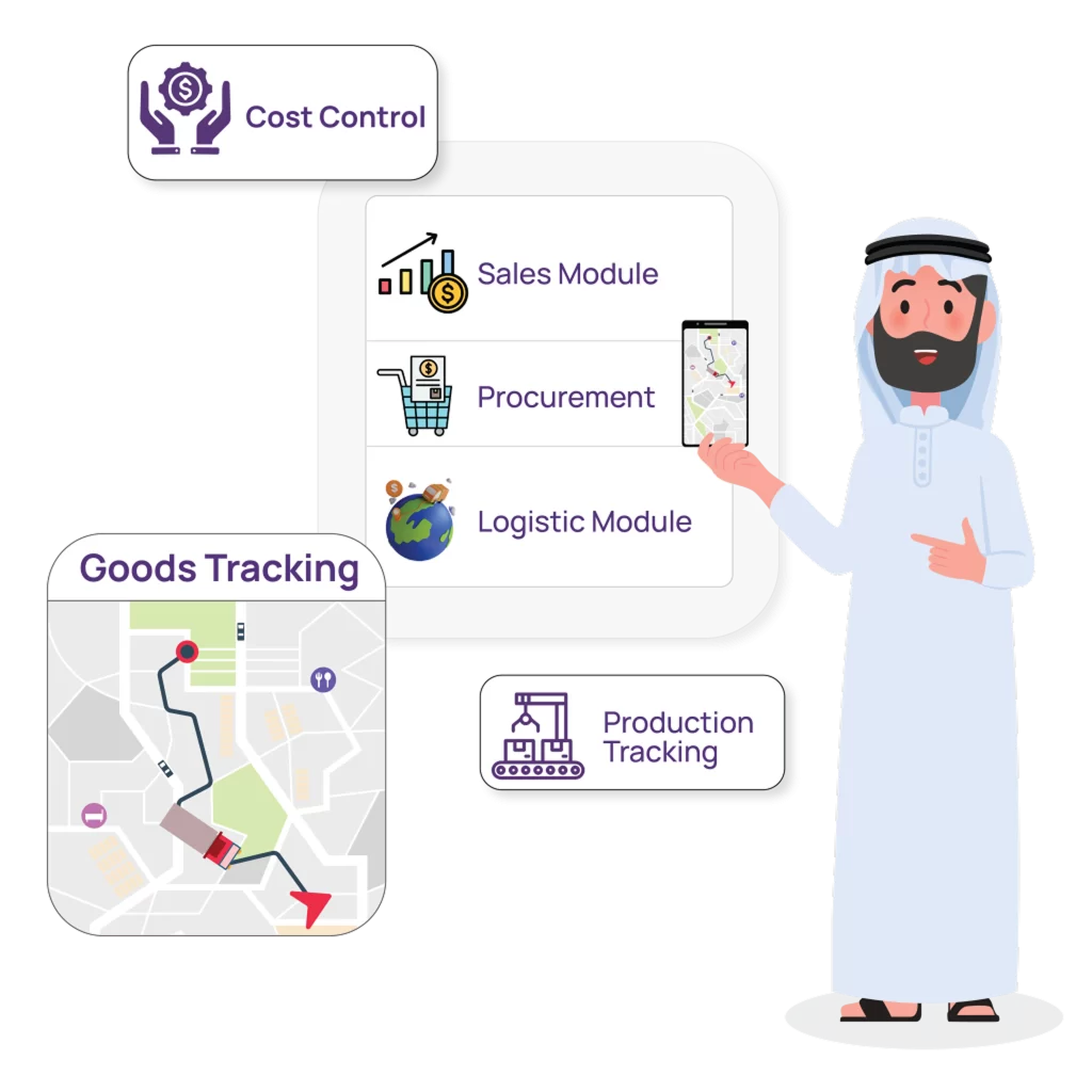 An illustration of a man and a diagram depicting various modules of a logistics or supply chain management system.